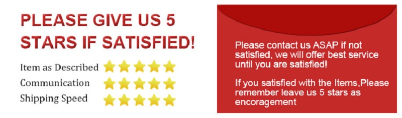 1. Please leave 5 star feedback if you're satisfied with our products and service, we will appreciate it (Item as Described 5 stars, Communication 5 stars, Shipping time 5-stars).